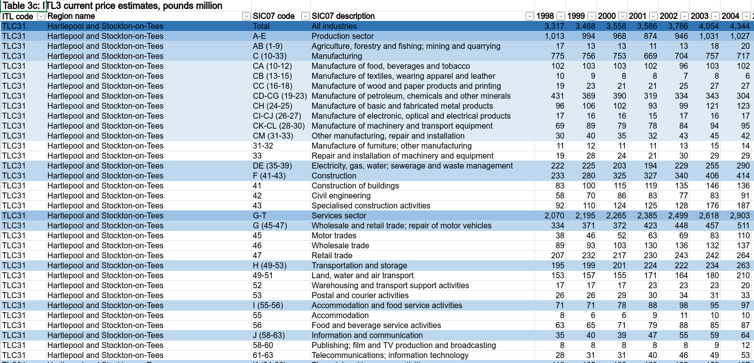 For every year back to 1998, we’ve got economic output down to ITL3 geography (i.e. most of the larger local authorities), for a range of up to 45 sectors (sector counts drop for smaller geographies).